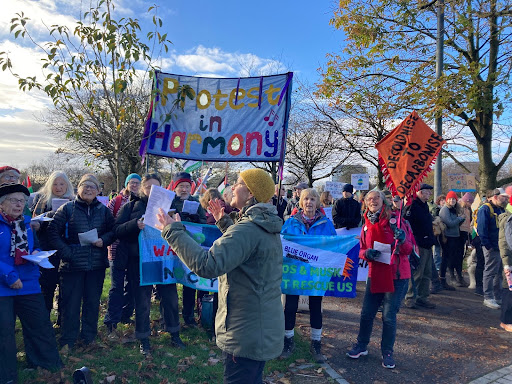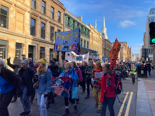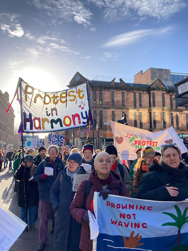 On 15 November members of Protest in Harmony travelled to Glasgow to take part in ‘Scotland’s Climate March: A Better World is Possible’. Timed to coincide with COP 30 in Belém, Brazil, the march was organised by a coalition of groups sharing a vision of a better world. The shared demands from the coalition were for Global Solidarity, a Fair Transition and Care for our Planet.